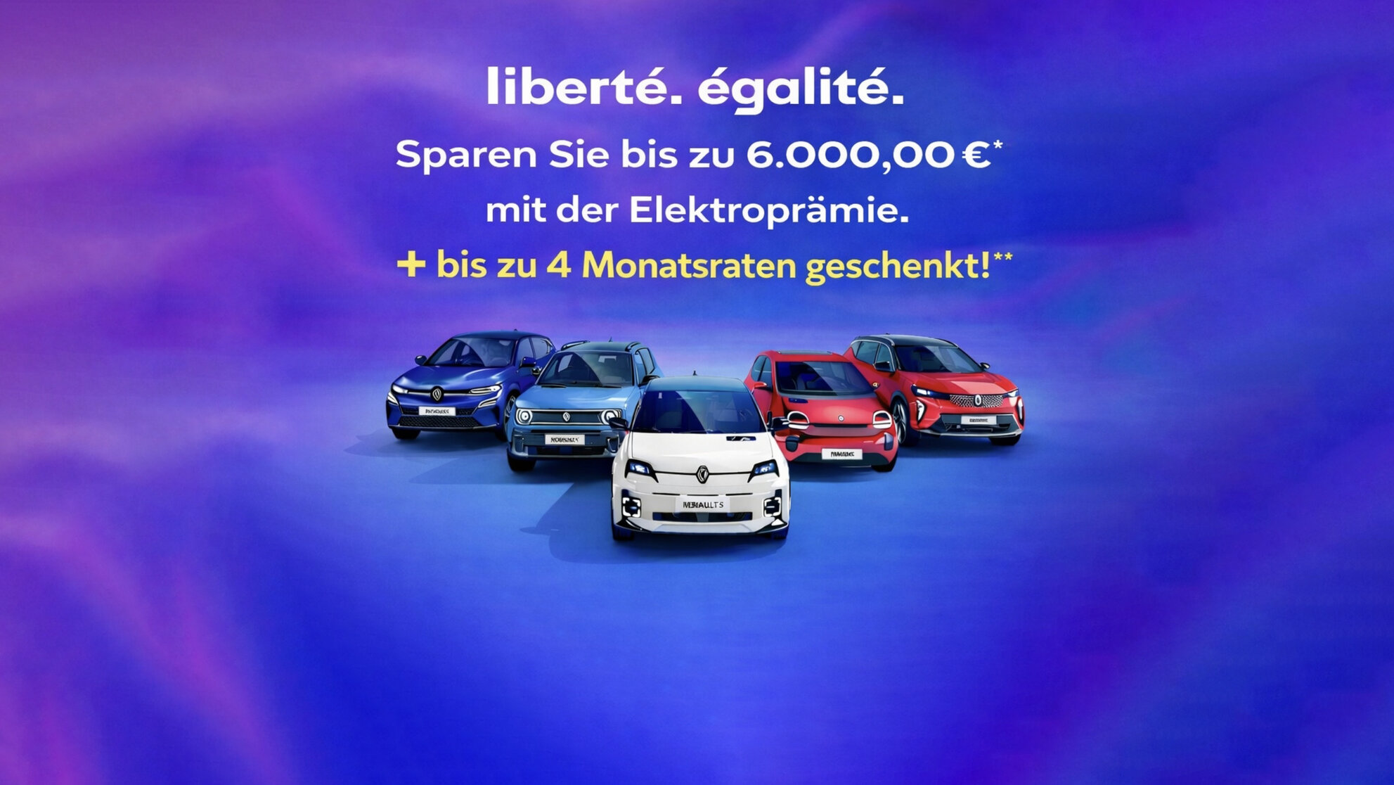**Gültig für Privatkunden und selbständige Einzelpersonen bei Leasing/Finanzierung ab 24 Monaten über Mobilize Financial Services. Max. Erstattung 2.000 € (4×500 €). Aktionszeitraum beachten. Ausgenommen Twingo E-Tech elektrisch & Rafale Hyper Hybrid.